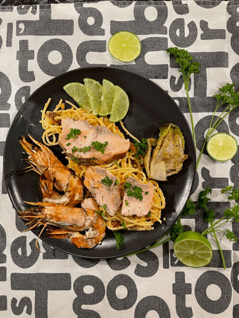 - Grill the tiger prawns and prepare the salmon together with the little gem on the BBQ and serve with the spaghetti Carbonada