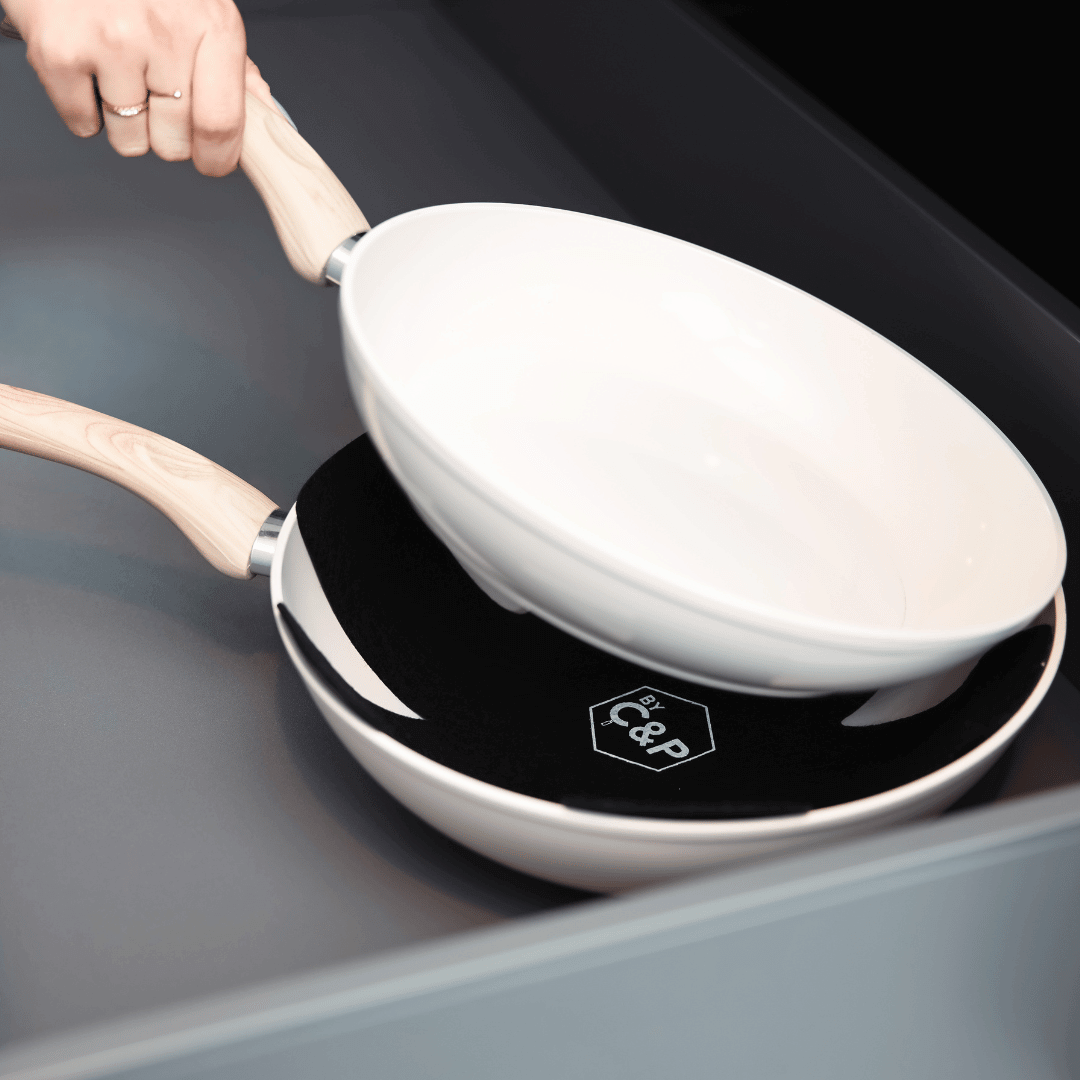 Leg de beschermers tussen je pannen en stapel ze zorgeloos. Met een diameter van 32 cm beschermen ze elke pan. Op maat knippen kan met een schaar.