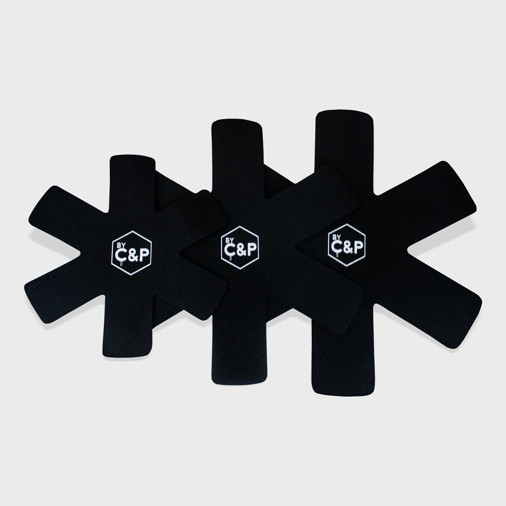 Van hoogwaardig polyester vilt, wasbaar op 30°C. De pannenbeschermers komen in een stijlvolle 3-pack.
